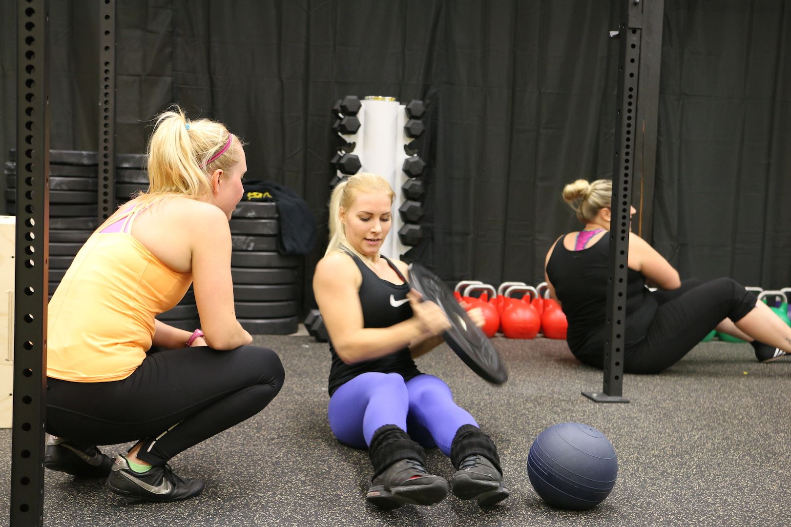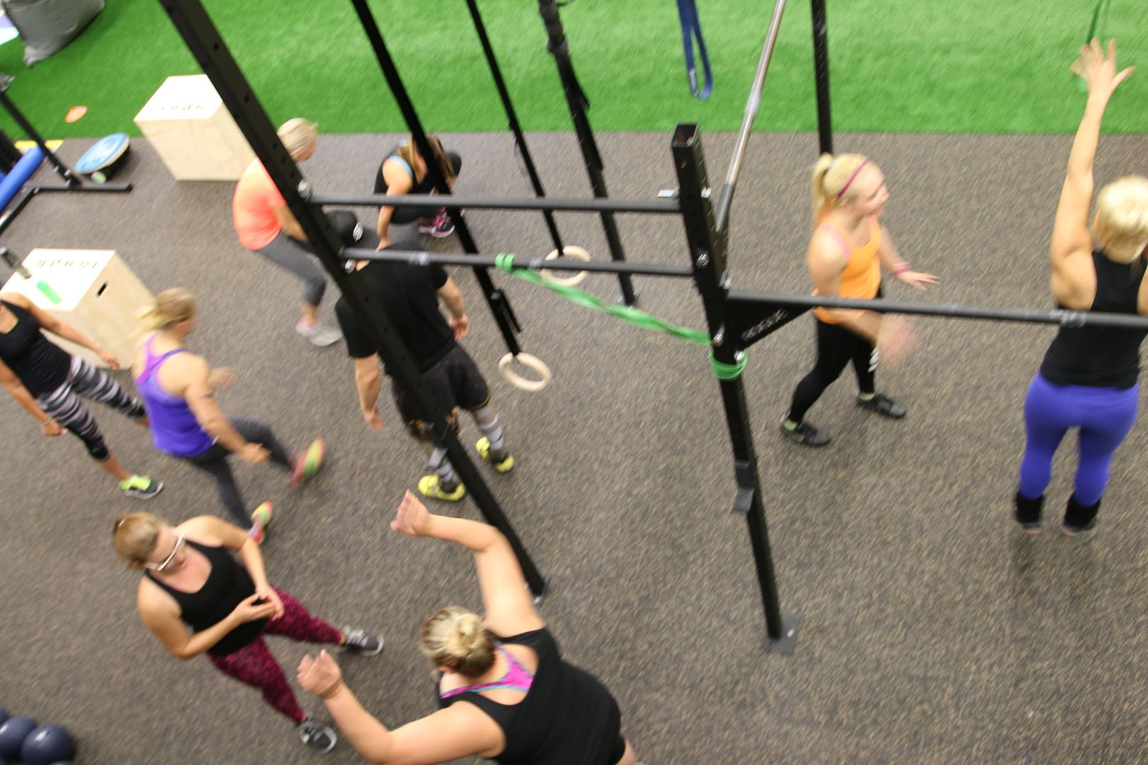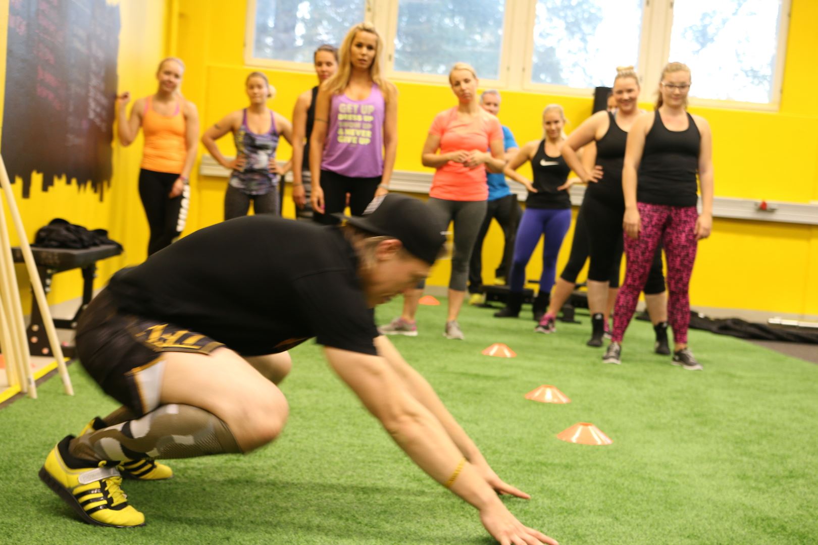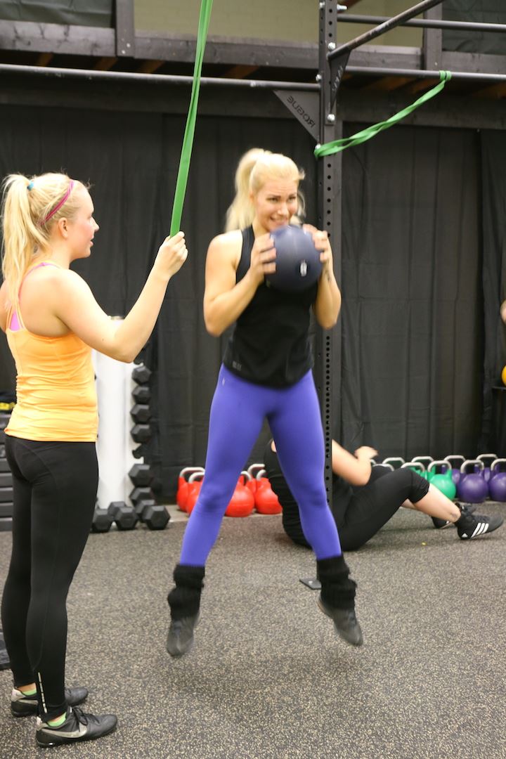 Treeni alkoi tarinalla asenteesta ja siitä, kuinka jokaisen pitää tehdä oma parhaansa. Innostavan intron jälkeen oltiin intopiukeena valmiina hommiin. Lämmittelyä ja sitten työosuus. Sammakkohyppelyä, burpeita, vatsoja ja viestiä. Monta kierrosta kaikenlaista, mutta loistavassa hengessä ja välillä parin kanssa, kaikki toisia tsempaten! Ihan kaikkea en voinut itse tehdä, mutta sovelsin ja yritin pysyä mukana. Onneksi sain parikseni meidän portaalista ihanan ja ymmärtävän Janinan <3 Kiitos valmennuksesta guumis!