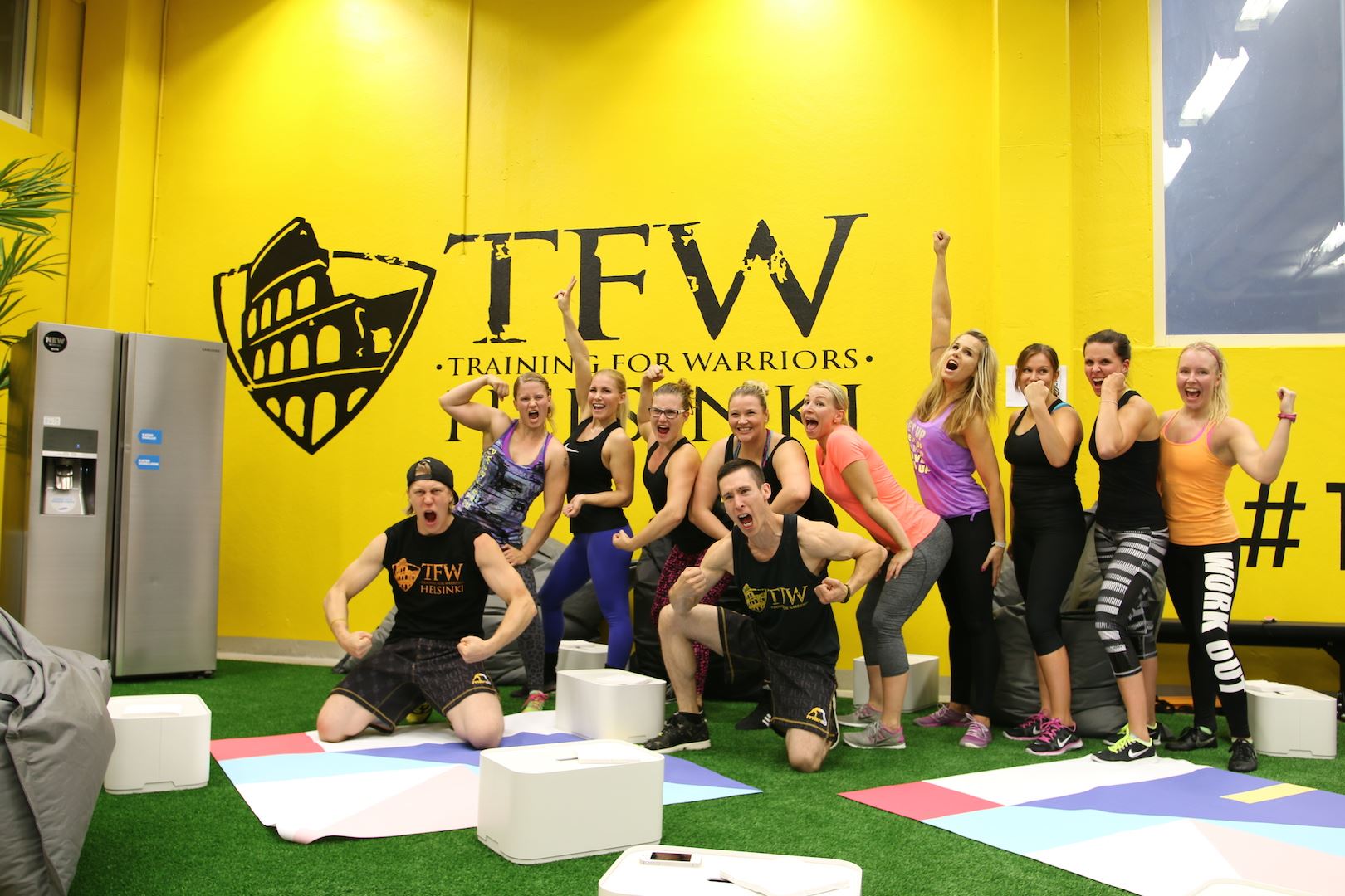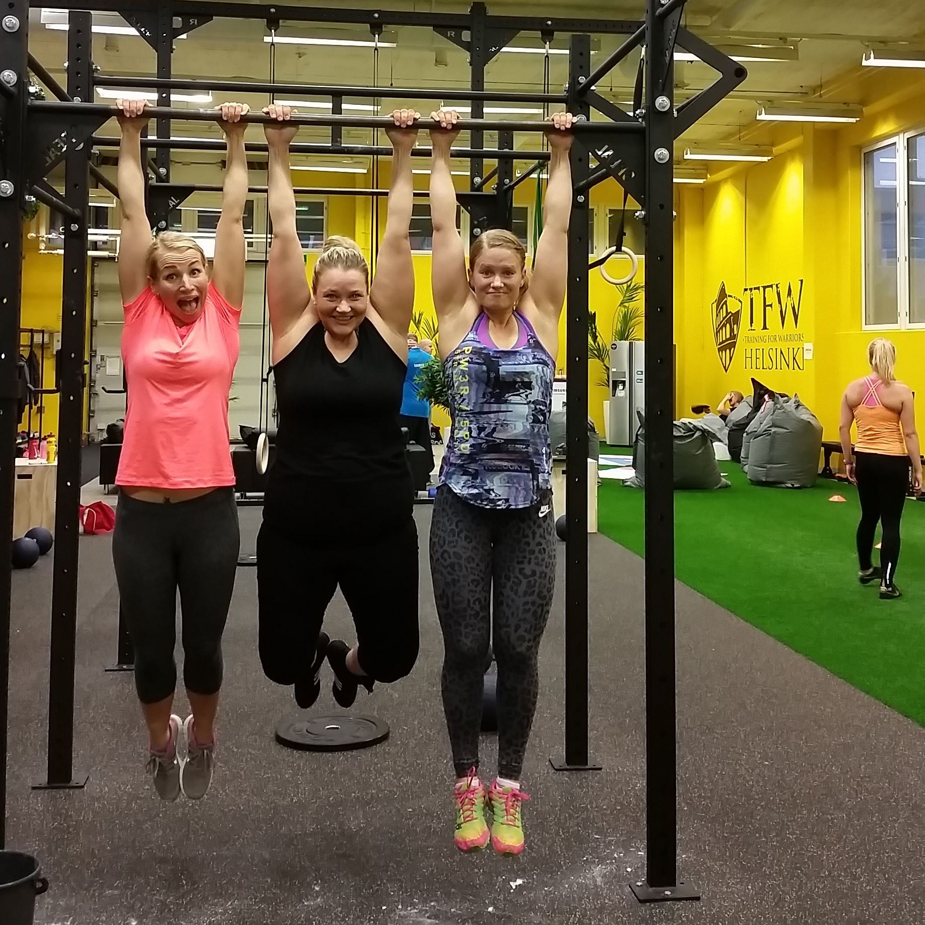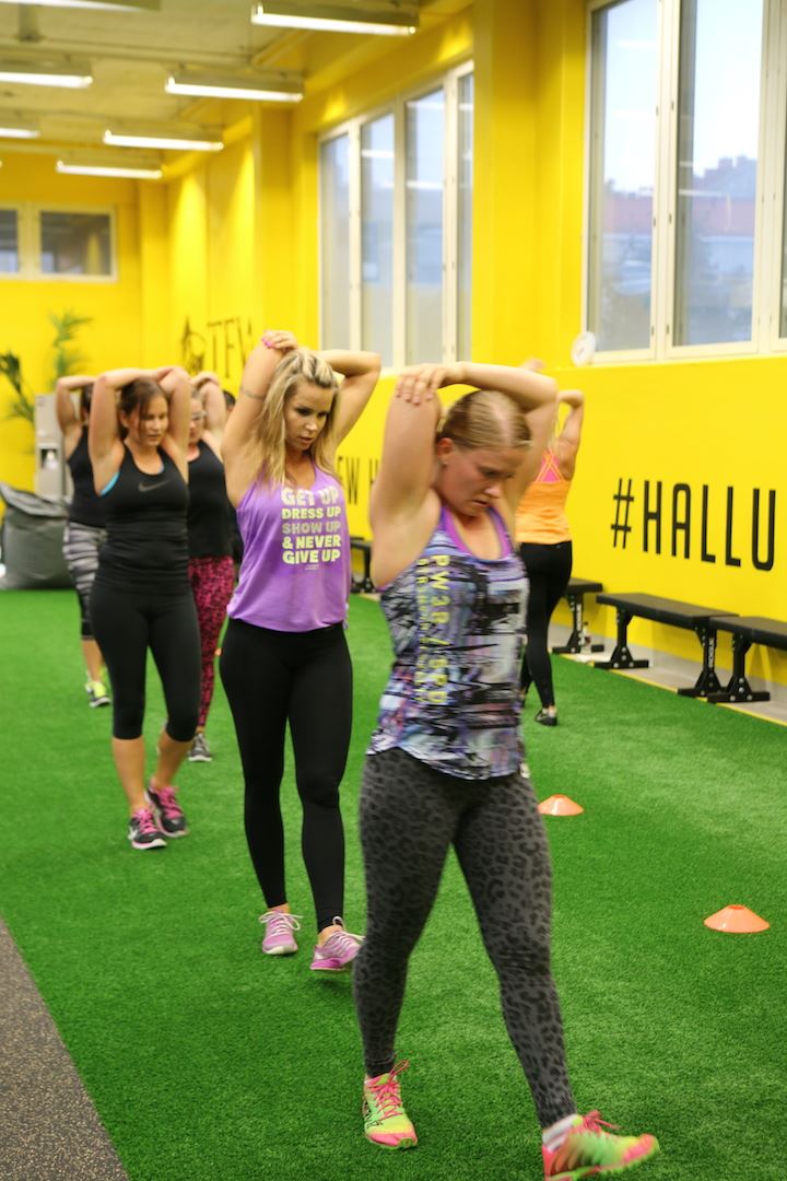 Koko tapahtuma pidettiin tässä ihan mun kotikulmilla Vallilassa ja treenit meille veti valmentajat Johannes ”Hatsolo” Hattunen, Petri ”Jet Lili” Rasanen. TFW Helsinki on virallinen Training For Warriors Affiliate. Salin tavoitteena on levittää positiivista sanomaa harjoittelusta, liikunnasta, hyvinvoinnista sekä reippaasta elämänasenteesta. Me kaikki oltiin ihan jännittyneitä ja jopa peloissaan kun tultiin tuonne, mutta pojat sai meidät rentoutumaan ja nauramaan. Mua itseä jännitti ihan kauheasti se, että miten jaksan ylipäätään ja täytyy myöntää, että mua jopa hävetti osallistua kun mietin että kaikki muut on niin sporttisia paitsi minä… Nielin kuitenkin sen epävarmuuden ja mietin, että jos en sen vuoksi salille uskaltaudu niin sitten saan lopun ikää murehtia ulkonäöstä. Jos ulkomuoto stressaa niin sille ehkä kannattaa tehdä jotain! Kuten mennä reippaasti mukaan 🙂 Voit monestakin kuvasta siis bongata vajaa 8 viikkoa sitten synnyttäneen valasmaisen maman mutta ei se mitään. Mun mielestä mä oon jopa vähän liikuttava kun tuolla lyllerrän mukana 😉