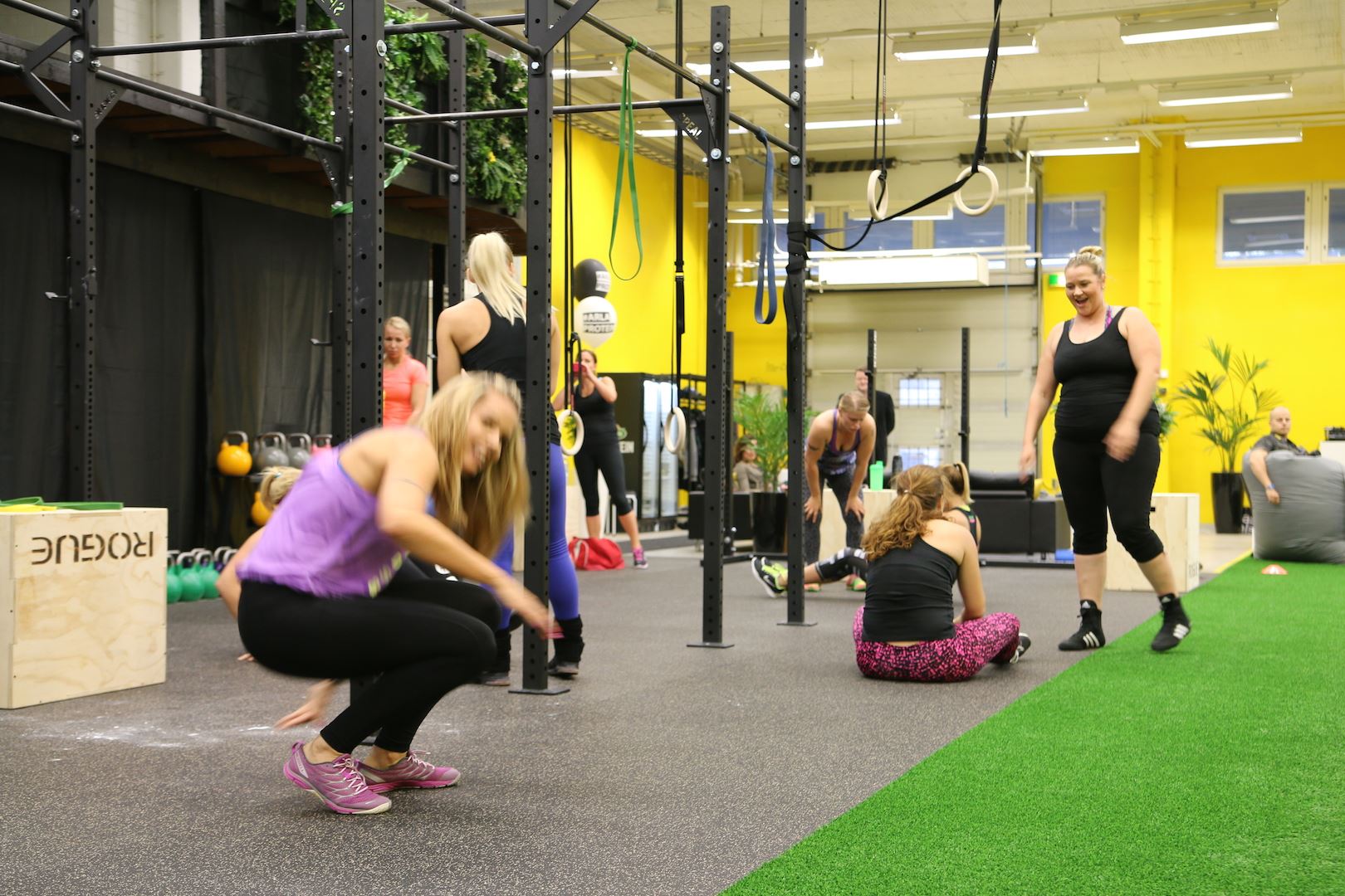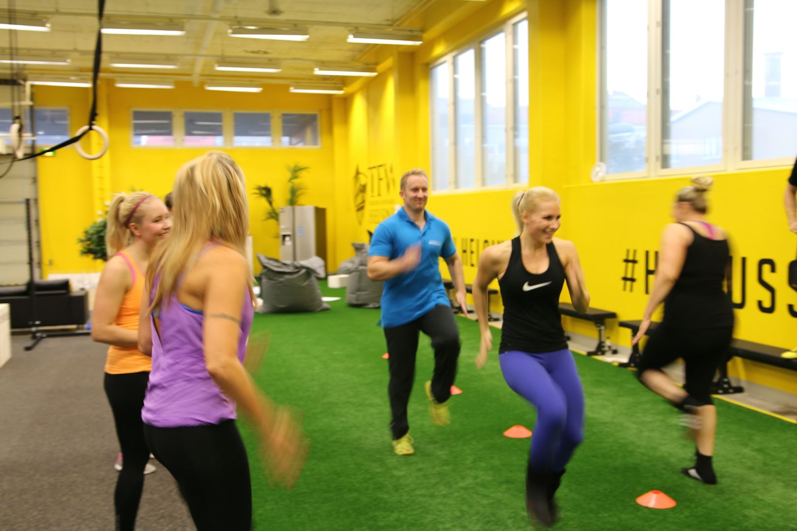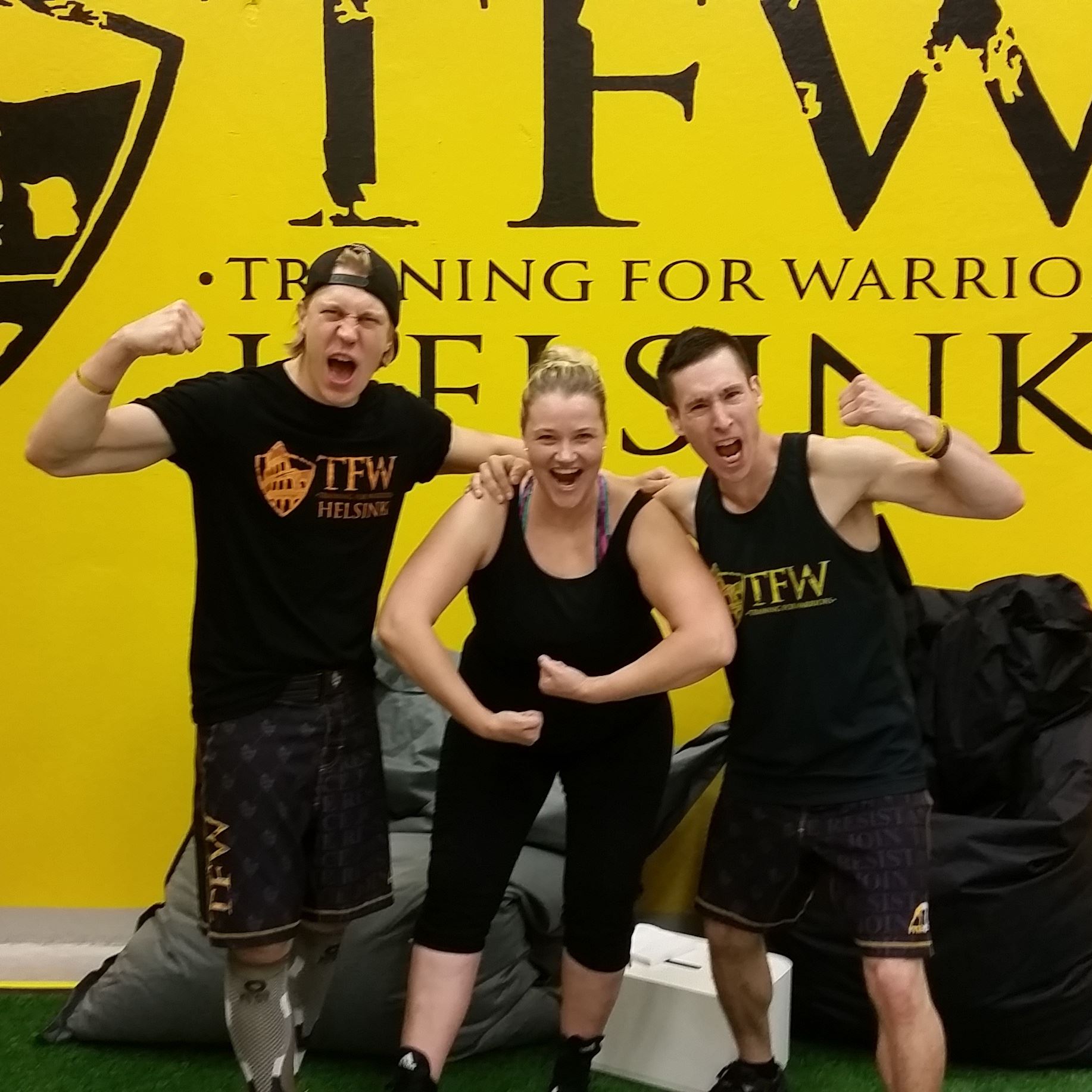 Koko tapahtuma pidettiin tässä ihan mun kotikulmilla Vallilassa ja treenit meille veti valmentajat Johannes ”Hatsolo” Hattunen, Petri ”Jet Lili” Rasanen. TFW Helsinki on virallinen Training For Warriors Affiliate. Salin tavoitteena on levittää positiivista sanomaa harjoittelusta, liikunnasta, hyvinvoinnista sekä reippaasta elämänasenteesta. Me kaikki oltiin ihan jännittyneitä ja jopa peloissaan kun tultiin tuonne, mutta pojat sai meidät rentoutumaan ja nauramaan. Mua itseä jännitti ihan kauheasti se, että miten jaksan ylipäätään ja täytyy myöntää, että mua jopa hävetti osallistua kun mietin että kaikki muut on niin sporttisia paitsi minä… Nielin kuitenkin sen epävarmuuden ja mietin, että jos en sen vuoksi salille uskaltaudu niin sitten saan lopun ikää murehtia ulkonäöstä. Jos ulkomuoto stressaa niin sille ehkä kannattaa tehdä jotain! Kuten mennä reippaasti mukaan 🙂 Voit monestakin kuvasta siis bongata vajaa 8 viikkoa sitten synnyttäneen valasmaisen maman mutta ei se mitään. Mun mielestä mä oon jopa vähän liikuttava kun tuolla lyllerrän mukana 😉