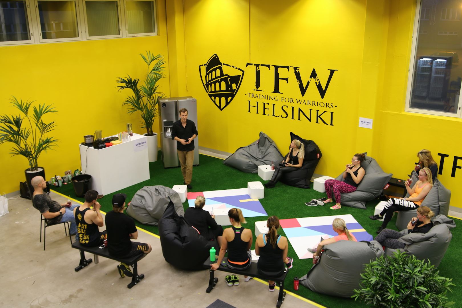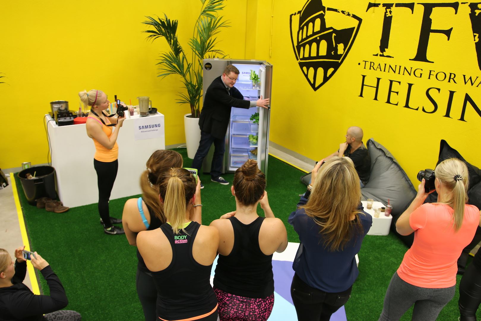 Meille bloggaajille satelee kutsuja kaikenlaisiin tapahtumiin ja viime aikoina tuntuu, että en oo päässyt osallistumaan yhtään mihinkään. On ollut showroomin shamppajailtaa, ravintoloiden avajaisia ja vaatekauppojen muotitapahtumia jne. mutta mulla on jäänyt kaikki sivusuun. Yksi tapahtuma johon ilmoittauduin kuitenkin oli Samsungin uuden Food ShowCase -jääkaapin esittelytilaisuus, sillä kutsu oli sen verran houkutteleva. Treenit mm. Elastisen omistamalla uudella TWF-salilla ja sen päälle Jaakko Halmetojan smoothiedemo. Toki myös jääkaapin hankinta on pian listalla niin ajattelin pitää välit lämpimänä 😀 Ja oi voi mitä olikaan luvassa. Tapahtuman ”juttu” oli haastetreeni ja täytyy myöntää että en arvannut mihin lupauduin. Treeni oli saman päivän iltana kun mulla oli ollut synnytyksen jälkitarkastus… Siellä sain luvan liikuntaan, poissulkien hyppiminen ja pomppiminen, sekä ne suorat vatsalihakset. Tuli sit korkattua tuo ”kunnon liikunta” aika kevyesti! 😉