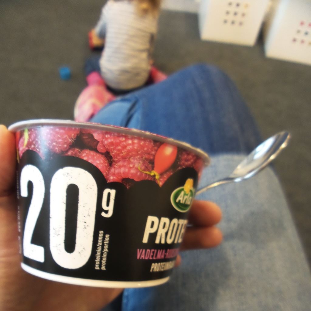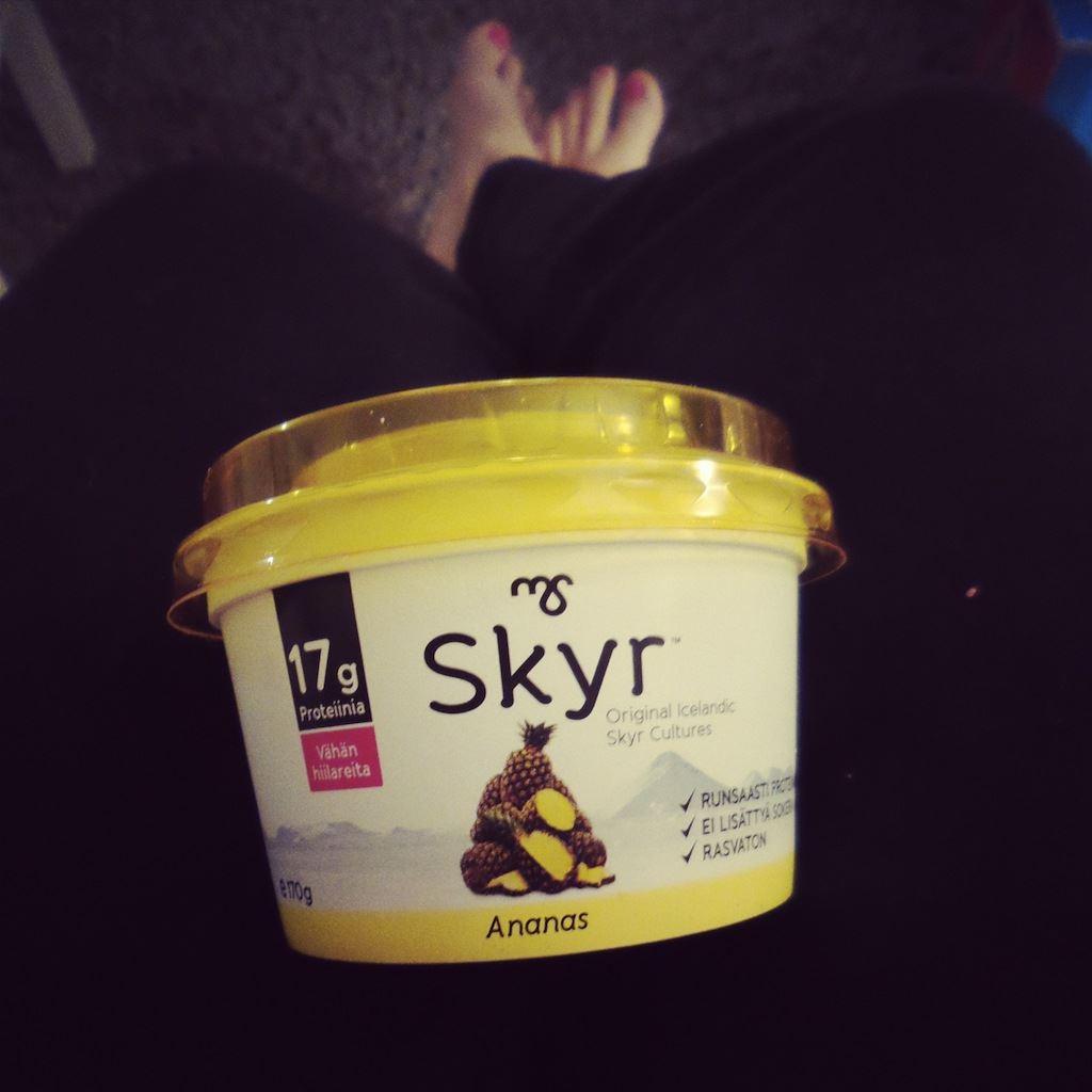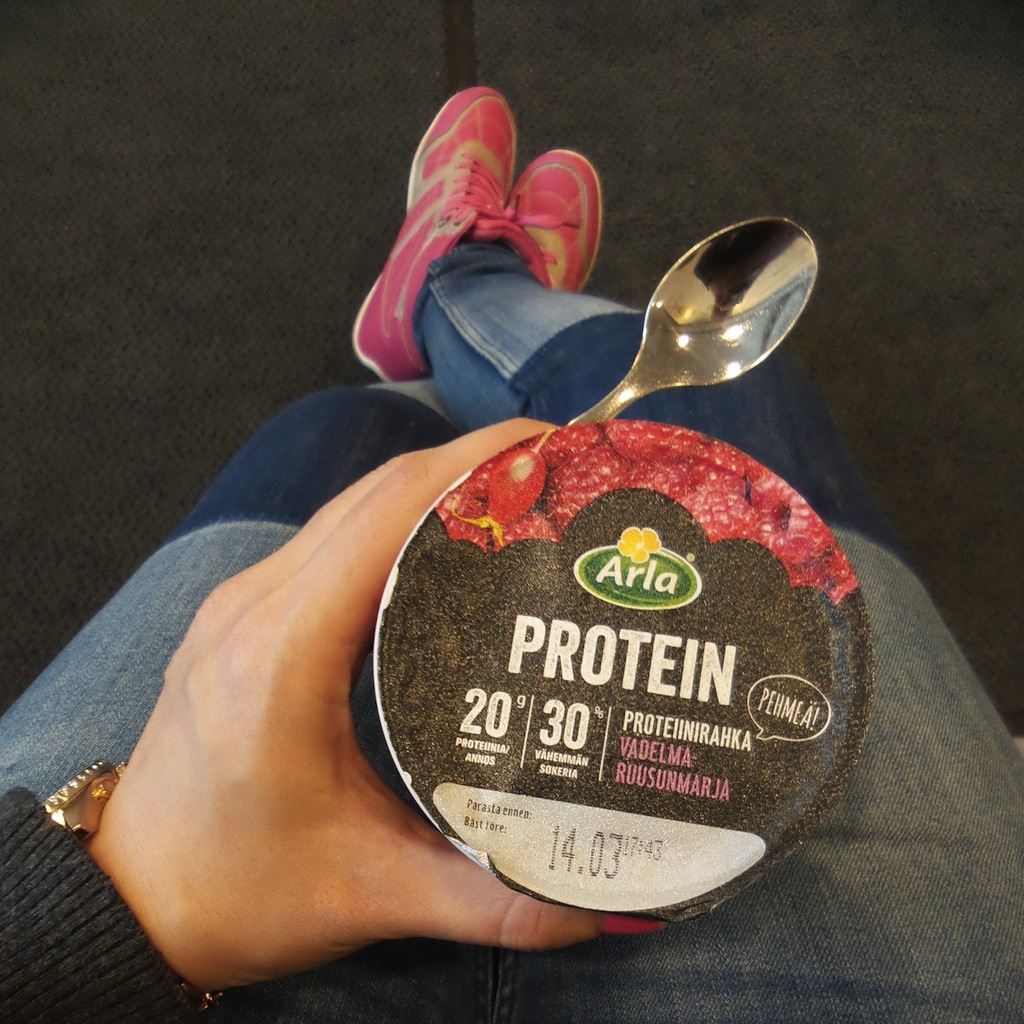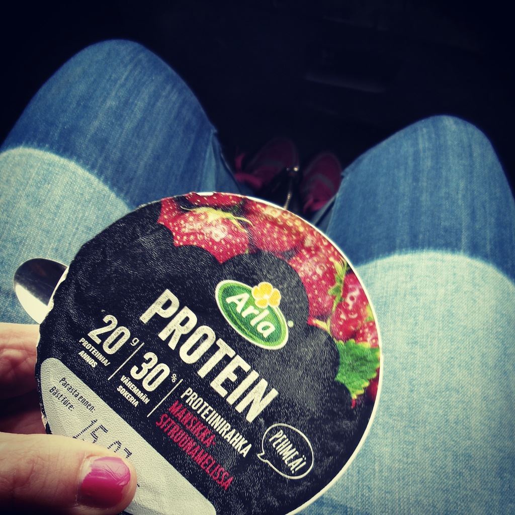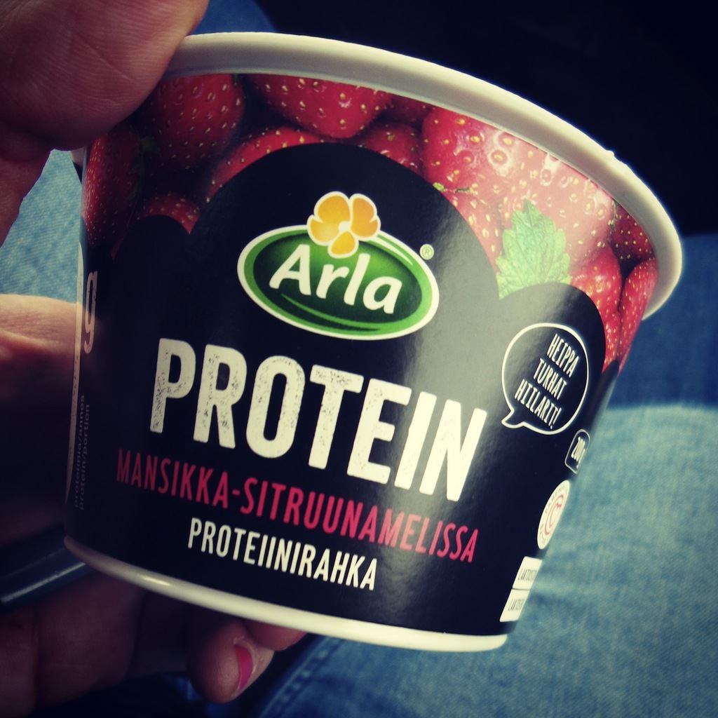 Rahka ja muut maitotuotteet on myös mun mieleen mutta niillä mulla ei tuu mässäiltyä samalla tavalla kuin vehnäsillä. Ihan puhdasta maitorahkaa tai maustettua rahkaa syön yleensä yhden purkin päivässä, joskus menee kaksi. Maustetun rahkan nappaan yleensä mukaan jos olen johonkin lähdössä mihin tiedän tarvitsevani mukaan pientä evästä. Maitorahkahan säilyy happamuutensa ansiosta huoneenlämmössä esimerkiksi käsilaukussa kaupoilla hyvän tovin tai treenikassissa treenin ajan.