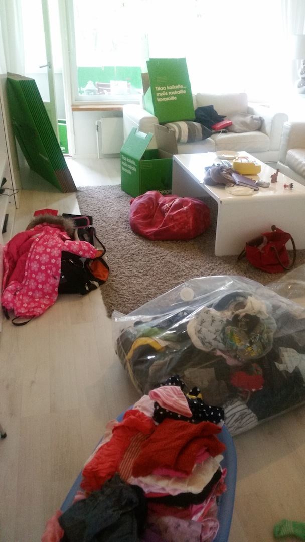 Pari päivää ankaraa pyykkäämistä, järjestelyä ja pakkaamista niin suurin työ (näiden vaatteiden osalta) on tehty. On se vaan hyvä, että me naiset näitä lapsia tehdään ja ollaan äitiyslomalla, en usko et yksikään mies selviytyisi tämän kaltaisesta urakasta edes puolessa vuodessa. Meillä miehen osuus oli hakea nuo vaatepussit kellarista ja sitäkin odottelin kaksi kuukautta. Että kiitos avusta vaan! Se on saletti et siinä vaiheessa kun valmiiksi pakattuja laatikoita aletaan kantamaan niin minä syön sitten pizzaa ja huutelen ohjeita!