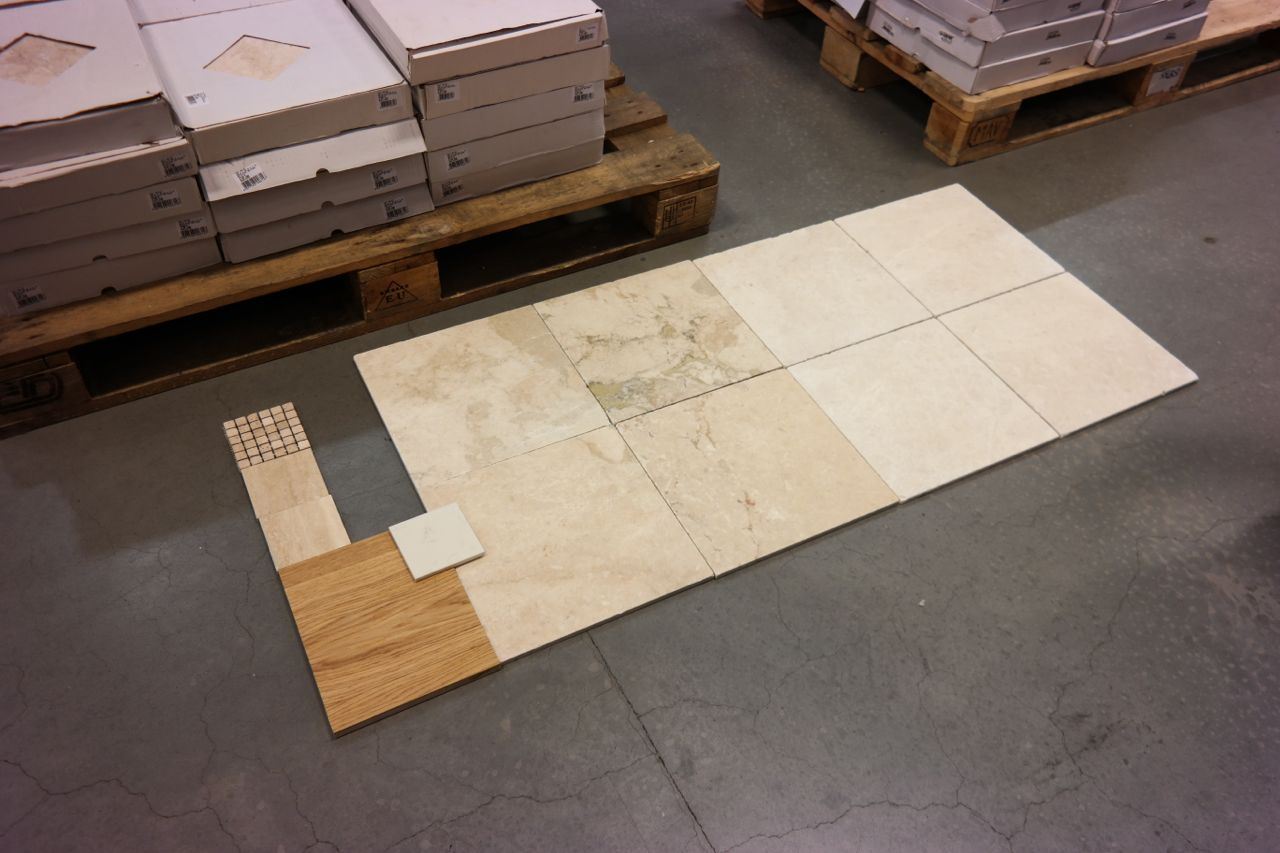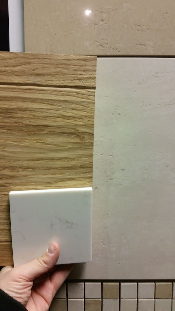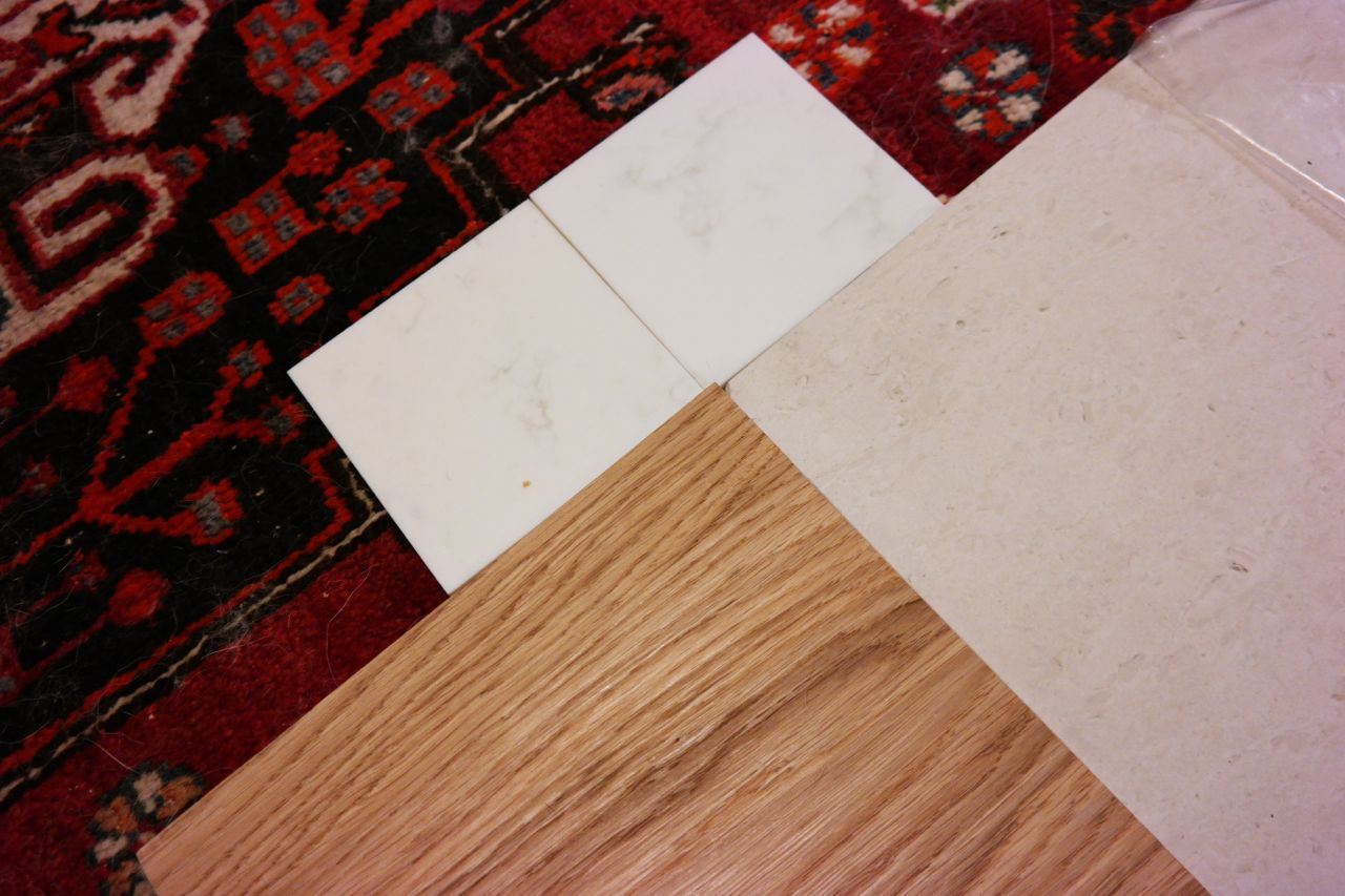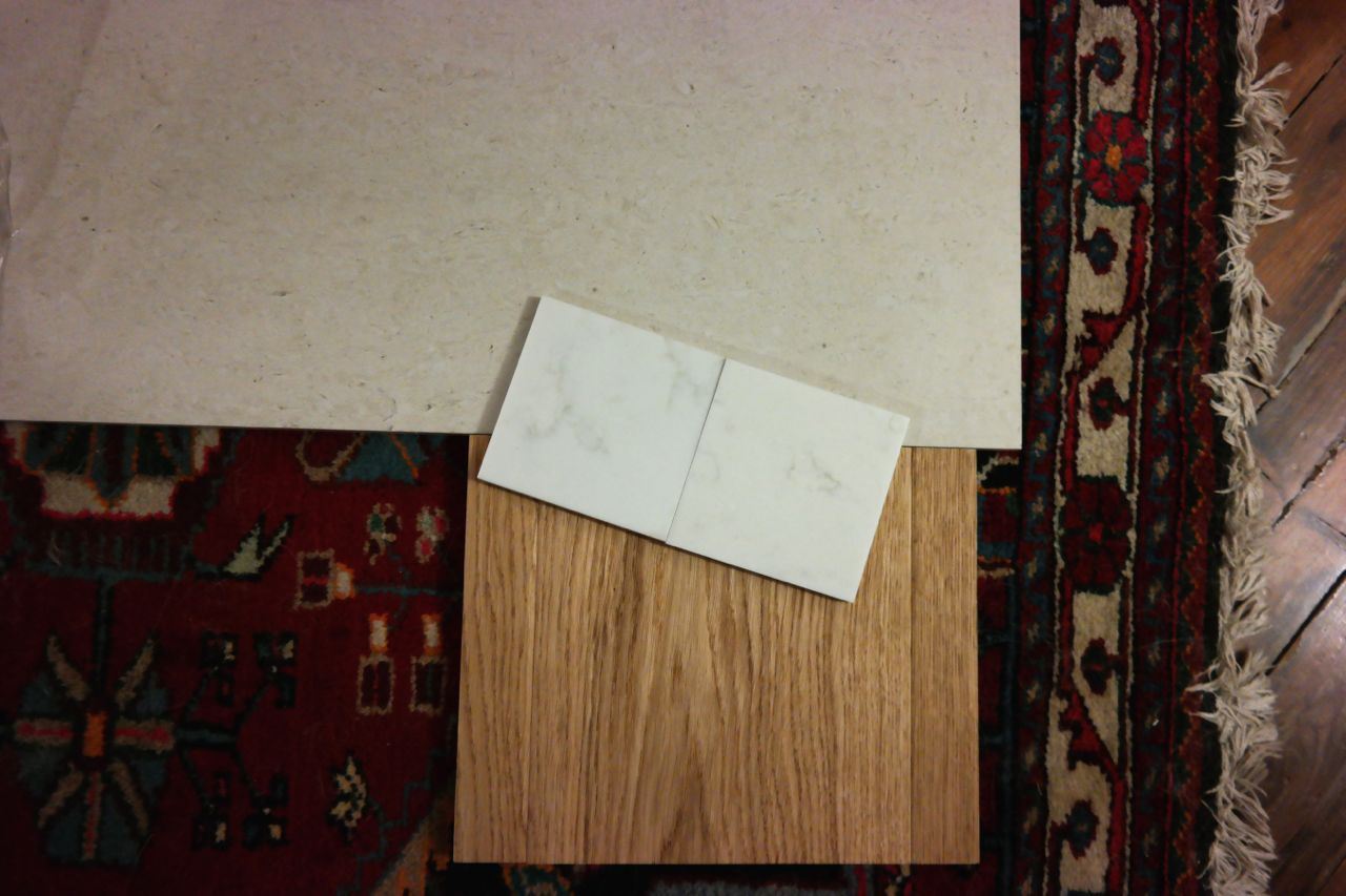Se miksi tuo valkoinen pieni mallipala seikkailee tuolla on se, että se on tulevan keittiötason ja saarekkeen materiaali. Työtasoiksi tulee siis Tulikiven Carrara marmorista tehty komposiitti. Sama kaunis ulkonäkö mutta ei niin huokoinen kuin pelkkä Carraran marmori. Taso tulee niin kätevästi laatan ja parketin päälle, että se on siksi mallailussa mukana.